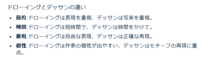 俺は芸術を専門に学んだことが無いので、ドローイングとデッサンの違いを知らないからgoogleで検索してみました↓
